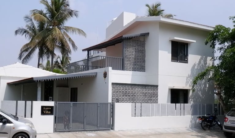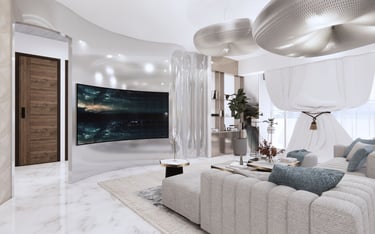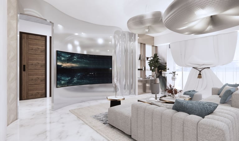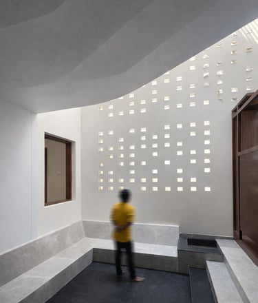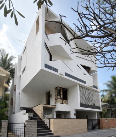 Curved balconies sculpt the elevation into a fluid, organic form that departs from rigid geometries. The architecture unfolds as a series of folded planes, creating a panoramic experience while shielding the home from direct road impact. These layered folds introduce depth, movement, and visual intrigue to the façade. The result is a dynamic street presence that balances expression with privacy.