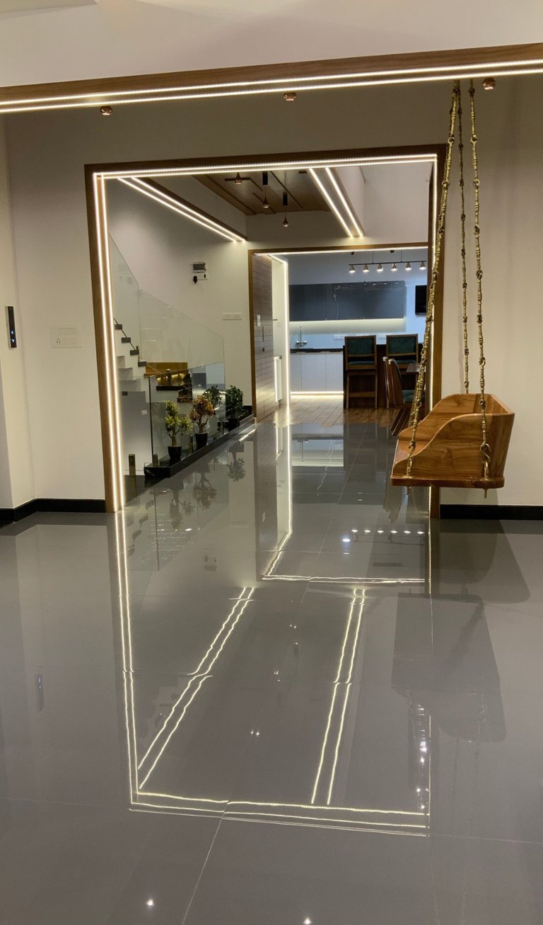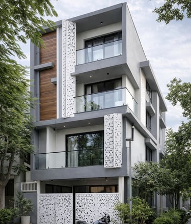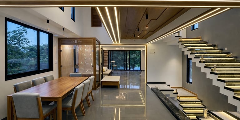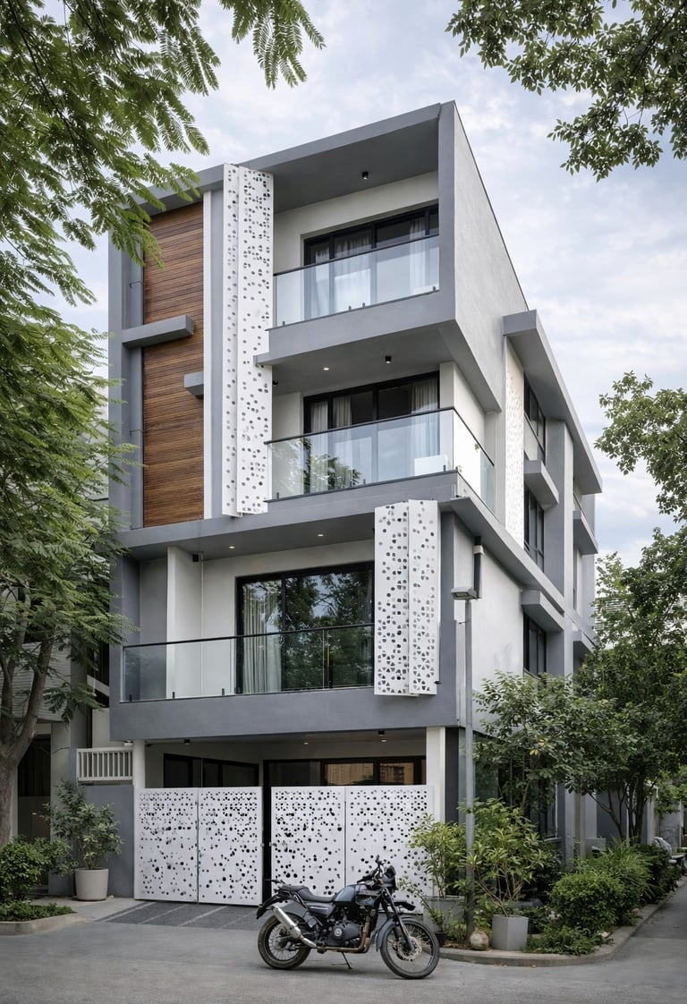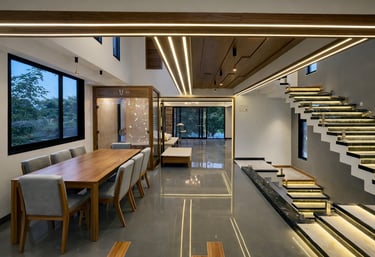 Designed on a compact 1000 sq.ft plot, the house is conceived to feel expansive from within. Spatial planning prioritises visual continuity, vertical openness, and controlled light to dissolve the sense of narrowness. Layers of transparency, double-height moments, and aligned sightlines create a seamless internal flow. The home reveals its scale gradually—proving that generosity of space is a design decision, not a site constraint.
