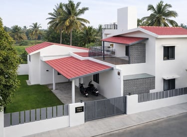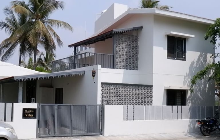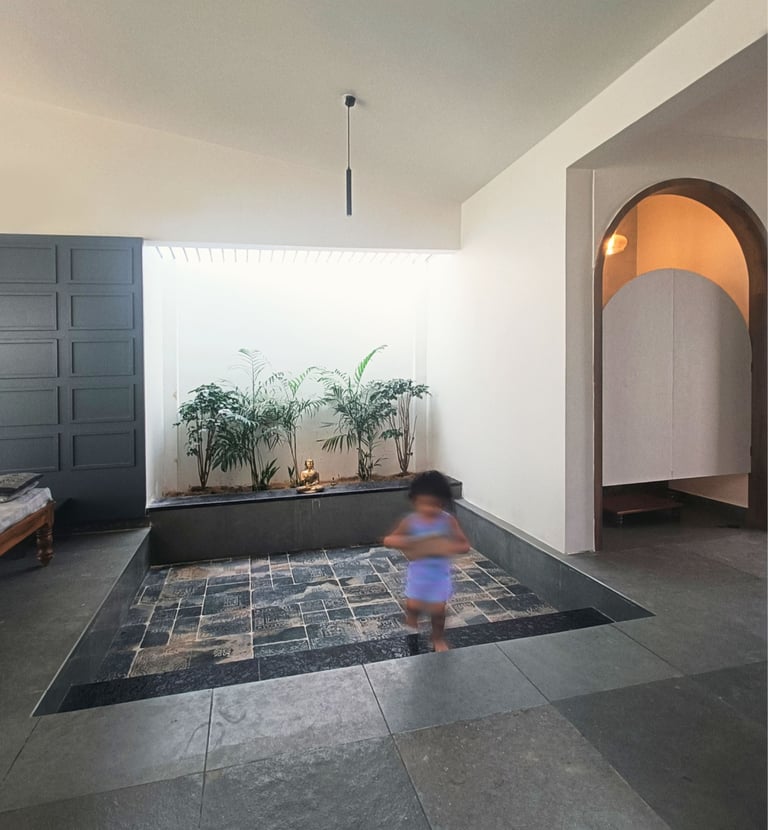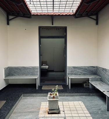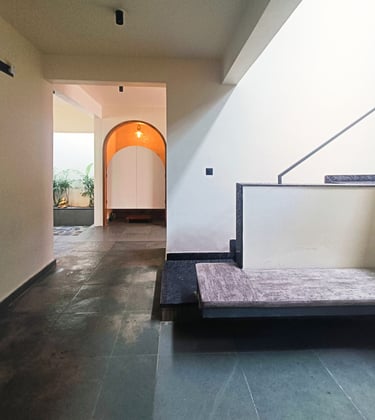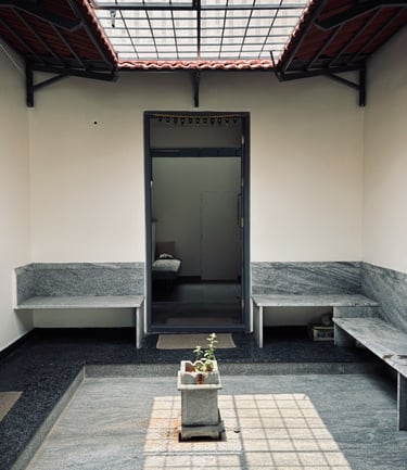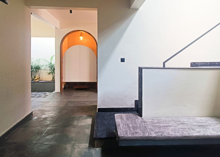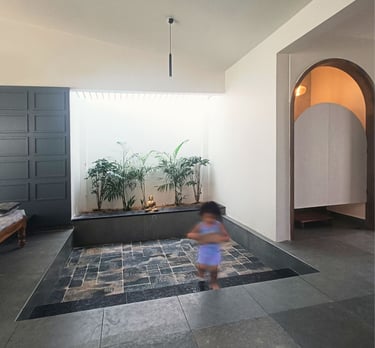 Planned on a compact urban plot, the house is organized around a series of courtyards that structure both movement and living. Public and private spaces are layered around these voids, ensuring constant visual and sensory connection without compromising privacy. Circulation is deliberately indirect, allowing residents to experience changing light, textures, and views as they move through the house. Materials are kept honest and tactile—stone, plaster, wood, and filtered light—reinforcing the calm, grounded nature of the spaces. The result is a home that feels open yet protected, contemporary yet rooted in climatic and cultural logic.