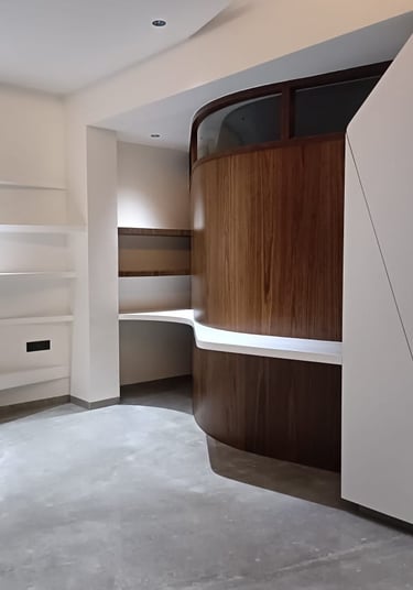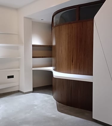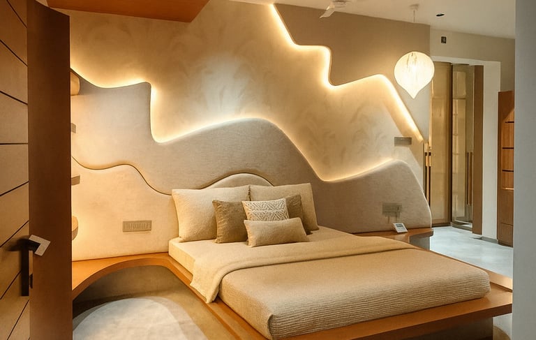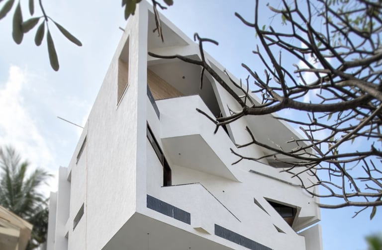 Curved balconies sculpt the elevation into a fluid, organic form that departs from rigid geometries. The architecture unfolds as a series of folded planes, creating a panoramic experience while shielding the home from direct road impact. These layered folds introduce depth, movement, and visual intrigue to the façade. The result is a dynamic street presence that balances expression with privacy.